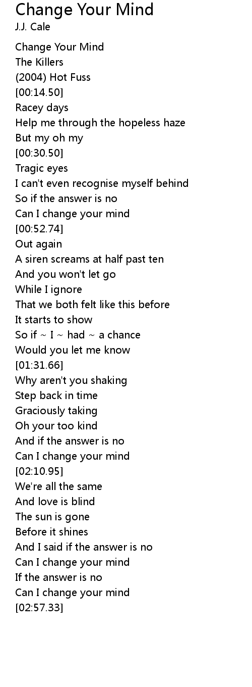 Change Your Mind Lyrics The Killers - Racy days, help me through the hopeless haze but my, oh my tragic eyes i can't even recognize myself behind so if the answer is no can i change your mind?