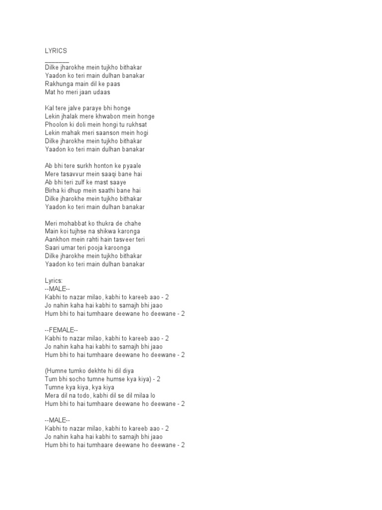 Kabhi Toh Nazar Milao Lyrics : Kabhi dil say dil milao hum bhi to hain tumhaaray deewane ho deewane.