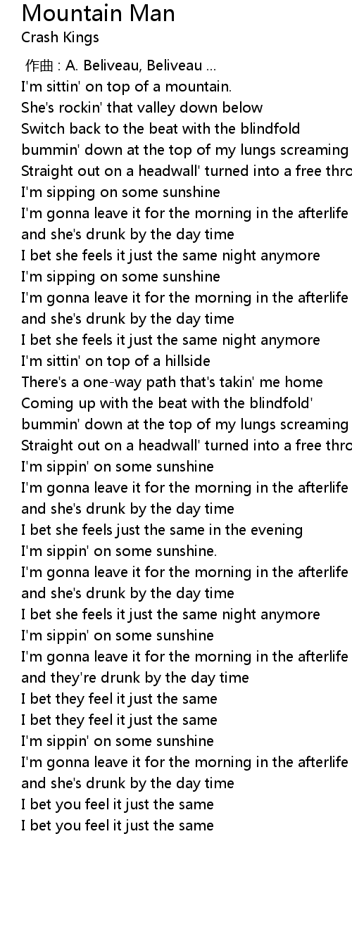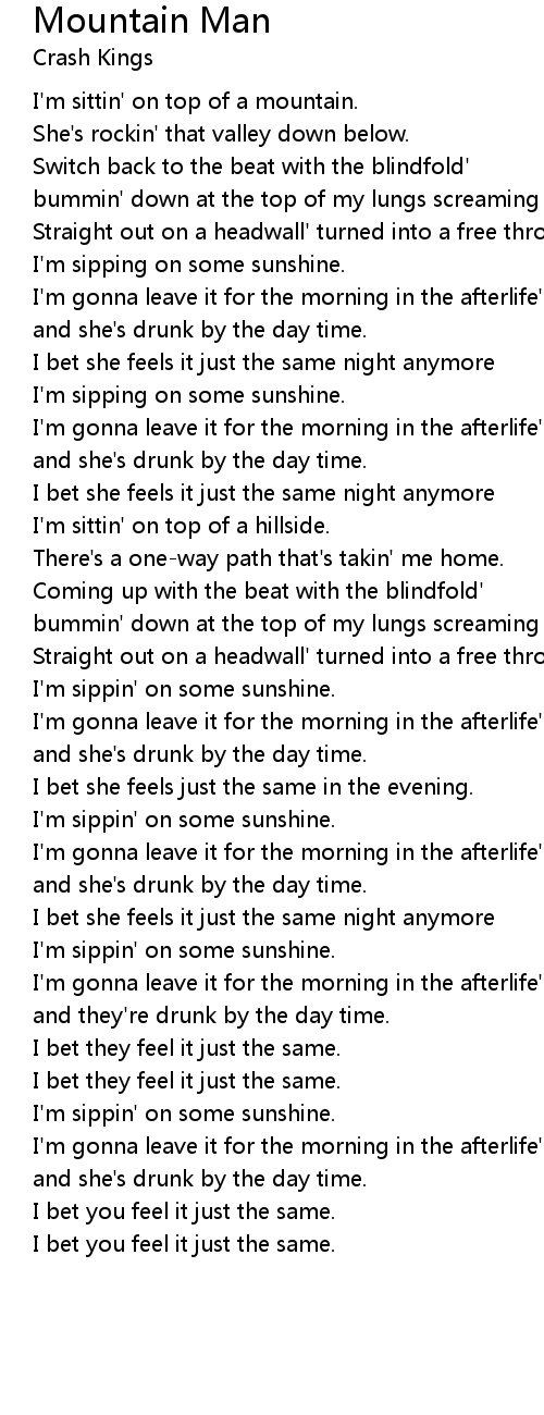 Mountain Man Lyrics Crash Kings - She's rockin that valley down below, switch back to the peak with a blindfold, bombing down.