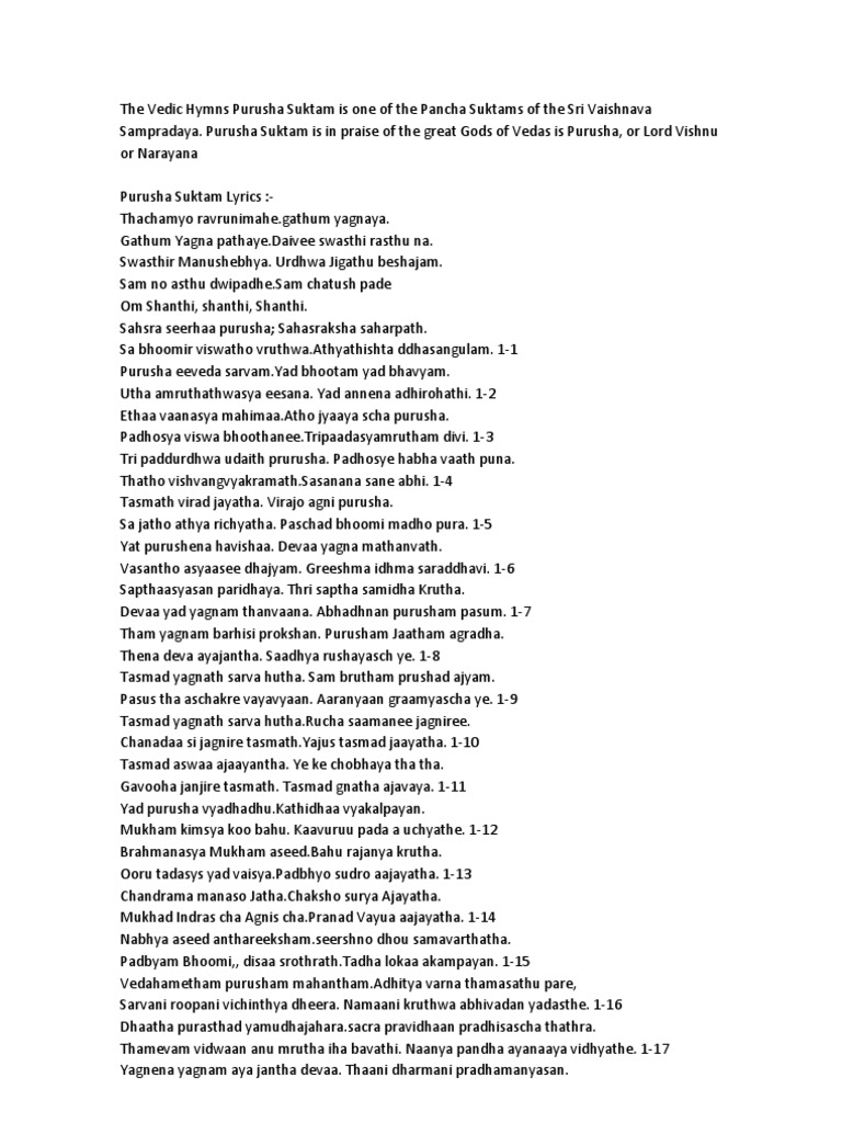 Purusha Suktam Lyrics With English Translation Hindu Philosophy Indian Religions Presenting beautiful purusha suktam with lyrics (lord narayana songs, vishnu songs, devotional songs, bhakthi songs) in the voice of s prakash kaushik.