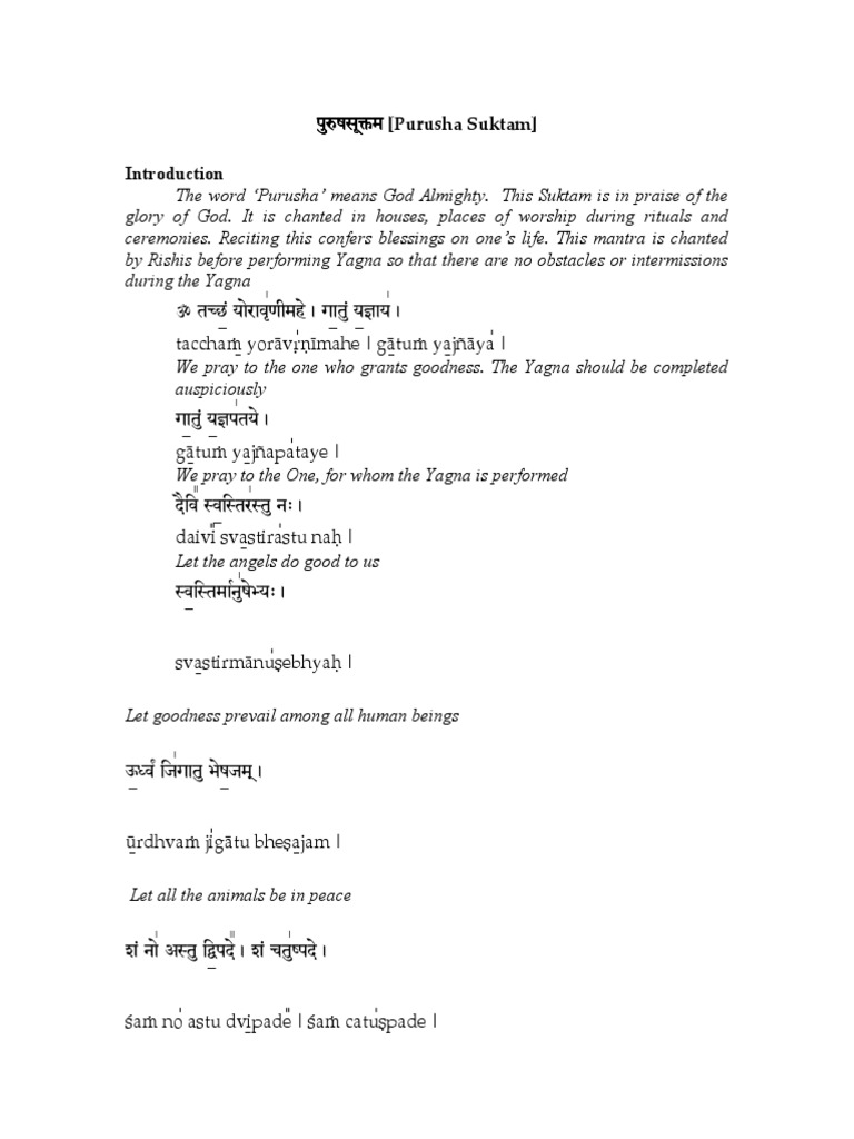 Purusha Suktam Sanskrit Pdf Download Peatix Ōṃ tacchaṃ yōrāvṛ'ṇīmahē | gātuṃ yajñāya' | gātuṃ yajñapa'tayē | daivī' vēdāhamētaṃ puru'ṣaṃ mahāntam'' | ādityava'rṇaṃ tama'sastu pārē | sarvā'ṇi rūpāṇi' vichitya dhīraḥ'.